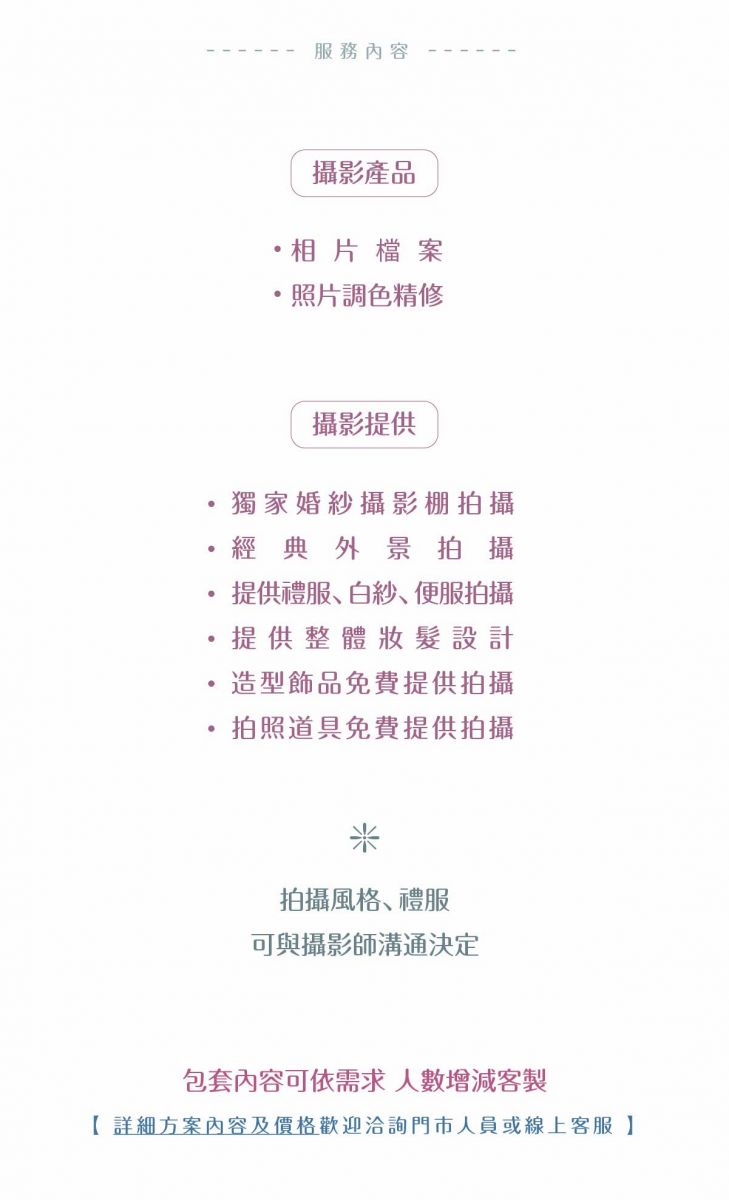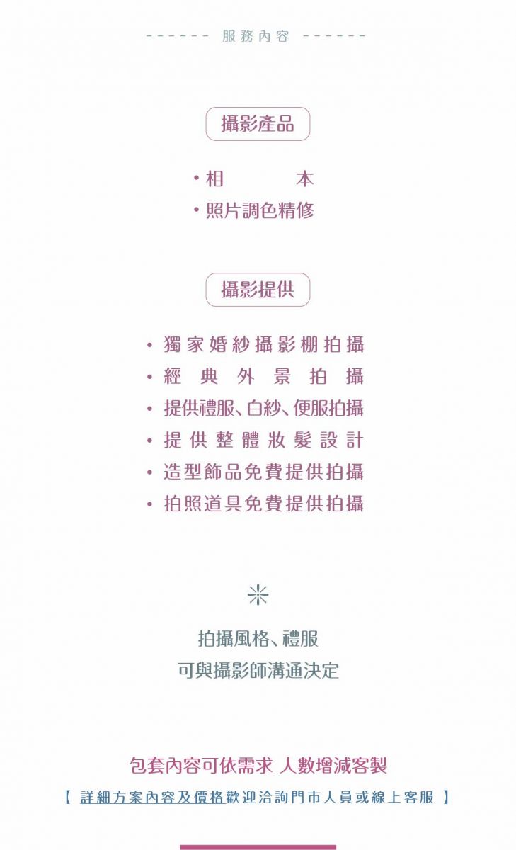 【♛攝影產品♛】・相本or 相片檔案・照片調色精修【♛攝影提供♛】・獨家婚紗攝影棚拍攝 ・經典外景拍攝 ・提供禮服、白紗、便服拍攝・提供整體妝髮設計・造型飾品免費提供拍攝・拍照道具免費提供拍攝【包套內容可依需求增減客製】
